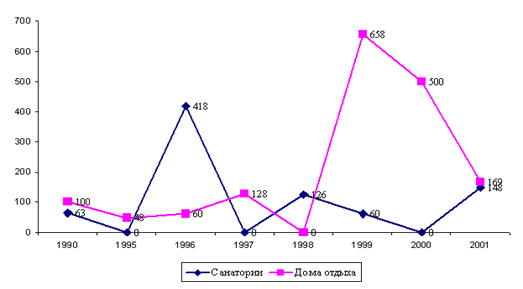 Говоря о динамике развития лечебно-курортных учреждений, туристических центром и баз отдыха, опираясь на данные статистического управления АРК можно привести следующие цифры: на территории полуострова в 2001 году функционировало 533 санаторно-курортных учреждения лечения и отдыха с коечным фондом в месяц максимального развертывания - 124,1 тысяч мест (из них 39,5 тысяч мест кругло-суточного функционирования) и 278оздоровительных лагерей на 26,1 тысяч мест. Кроме того на территории АРК функционировали 84 предприятия гостиничного типа, в 2001 году из которых: 52 составляли гостиницы, 2 кемпинга, 12 турбаз, 18 общежитий для приезжих.